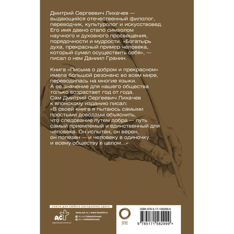 Письма о добром и прекрасном. "Письма о добром и прекрасном" - книга, которую академик Лихачёв посвятил российскому юношеству. В этом произведении ученый, которого неоднократно называли "совестью нации", обращается к проблемам нравственного воспитания молодежи. Честь, искренность, правдолюбие, бескорыстие, интеллигентность, достоинство - как редко, увы, сегодня вспоминает о них подрастающее поколение, с малолетства нацеленное на успех и материальные блага. Быть может, книга Лихачёва научит их, что прежде всего человеку следует быть человеком - уметь любить, верить, бороться за свои убеждения и видеть и ценить красоту?..