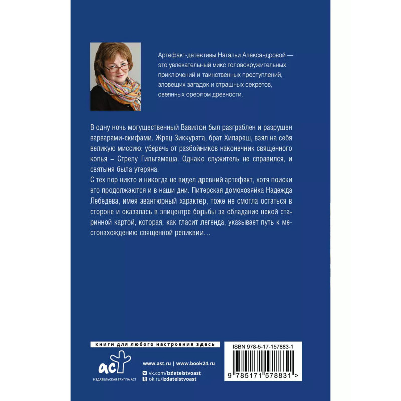 Стрела Гильгамеша. В одну ночь могущественный Вавилон был разграблен и разрушен варварами-скифами. Жрец Зиккурата, брат Хилареш, взял на себя великую миссию: уберечь от разбойников наконечник священного копья - Стрелу Гильгамеша. Однако служитель не справился, и святыня была утеряна. С тех пор никто и никогда не видел древний артефакт, хотя поиски его продолжаются и в наши дни. Питерская домохозяйка Надежда Лебедева, имея авантюрный характер, тоже не смогла остаться в стороне и оказалась в эпицентре борьбы за обладание некой старинной картой, которая, как гласит легенда, указывает путь к местонахождению священной реликвии