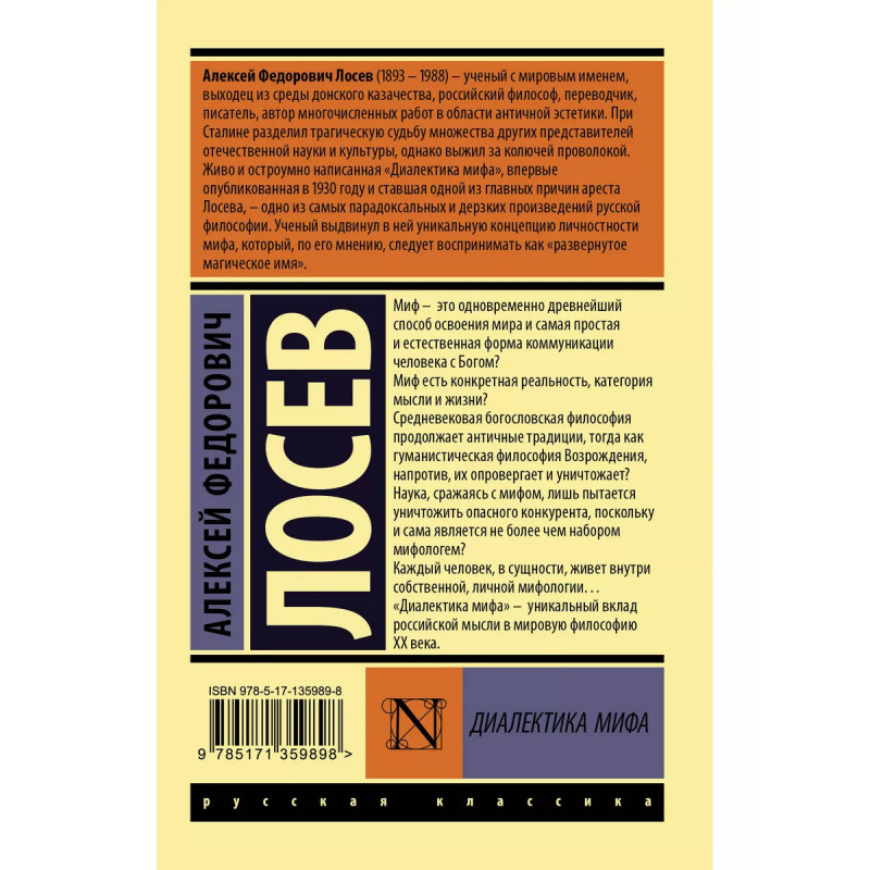 Диалектика мифа. Миф - это одновременно древнейший способ освоения мира и самая простая и естественная форма коммуникации человека с Богом? Миф есть конкретная реальность, категория мысли и жизни? Средневековая богословская философия продолжает античные традиции, - тогда как гуманистическая философия Возрождения, напротив, их опровергает и уничтожает? Наука, сражаясь с мифом, лишь пытается уничтожить опасного конкурента, поскольку и сама является не более чем набором мифологем? Каждый человек, в сущности, живет внутри собственной, личной мифологии "Диалектика мифа" - уникальный вклад российской мысли в мировую философию ХХ века.