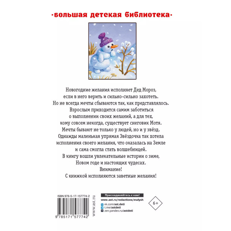 Весёлые зимние истории. Новогодние желания исполняет Дед Мороз, если в него верить и сильно-сильно захотеть. Но не всегда мечты сбываются так, как представлялось. Взрослым приходится самим заботиться о выполнении своих желаний, а для тех, кому совсем некогда, существует снеговик Мотя. Мечты бывают не только у людей, но и у звёзд. Однажды маленькая упрямая Звёздочка так хотела исполнения своего желания, что оказалась на Земле и сама смогла стать волшебницей. В книгу вошли увлекательные истории о зиме, Новом годе и настоящих чудесах. Внимание! С книжкой исполняются заветные желания!