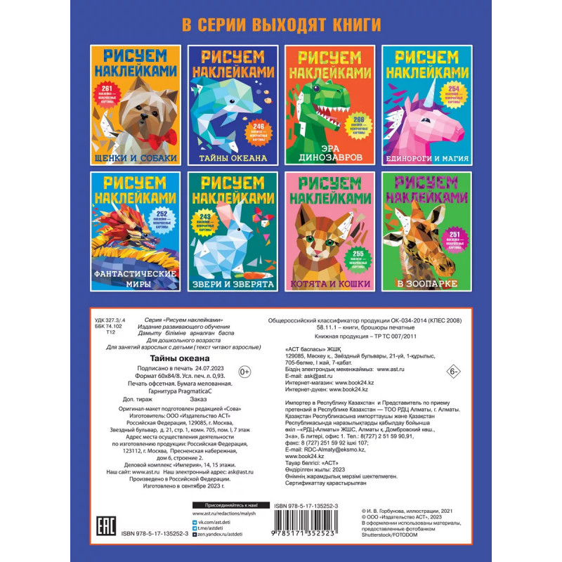 Тайны океана. В новой серии книг "Рисуем наклейками" - игровые задания с геометрическими стикерами, необыкновенно популярные во всем мире. В уникальной книжке ребята увидят кита, касатку, дельфина, акулу, которых можно раскрасить стикерами, подобрав наклейки по номерам. Юным художникам обязательно понравятся интересные задания на развитие логики, памяти, внимания, мелкой моторики. Книжка для всех, кто любит рисовать и своими руками создавать коллажи из наклеек. " Ребенок может создать своими руками уникальные картинки с 3D-эффектом. " На каждой странице книги - образец рисунка и его символьная схема. Указаны номера наклеек разных форм и оттенков - приклеивать их лучше, соблюдая порядковый счет. " Раскраска-мозаика поможет малышу проявить свои творческие способности, развить мелкую моторику и пространственное мышление. " Занимательные задания с наклейками - всё, что нужно для развития интеллектуальных и личностных качеств ребенка. " Красочные иллюстрации + более 25 геометрических стикеров. Рисуем наклейками, развиваем логик