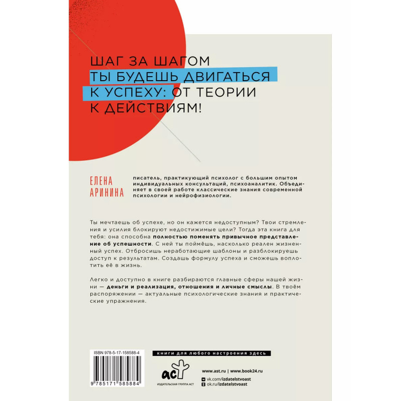 Разблокируй успех. Деньги, реализация, смыслы, отношения. Ты мечтаешь об успехе, но он кажется недоступным? Твои стремления и усилия блокируют недостижимые цели? Тогда эта книга для тебя: она способна полностью поменять привычное представление об успешности. С ней ты поймёшь, насколько реален жизненный успех. Отбросишь неработающие шаблоны и разблокируешь доступ к результатам. Создашь формулу успеха и сможешь воплотить её в жизнь. Легко и доступно в книге разбираются главные сферы нашей жизни - деньги и реализация, отношения и личные смыслы. В твоём распоряжении - актуальные психологические знания и практические упражнения. Шаг за шагом ты будешь двигаться к успеху: от теории к действиям!
