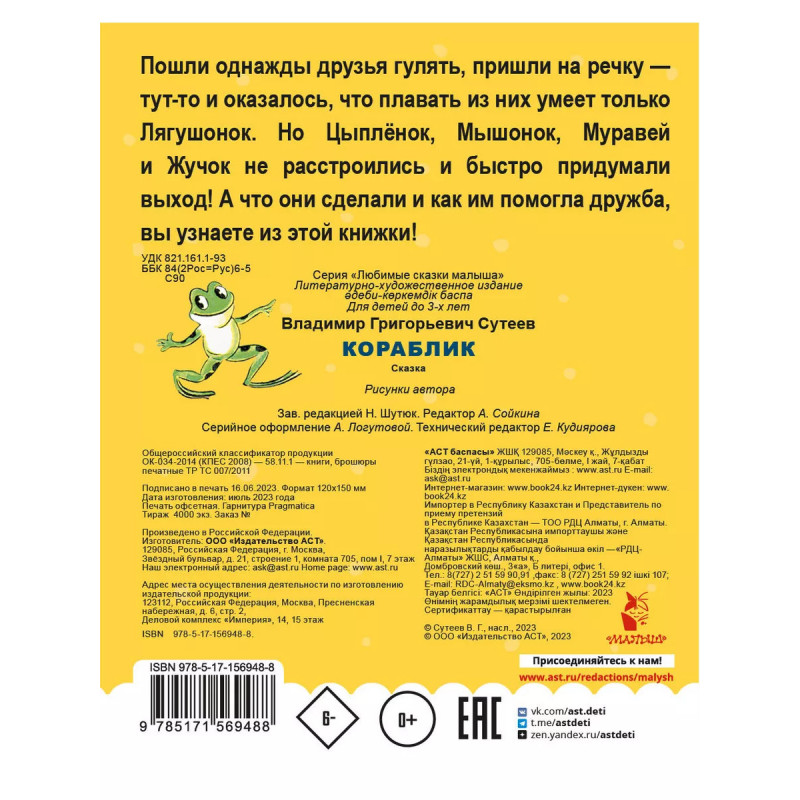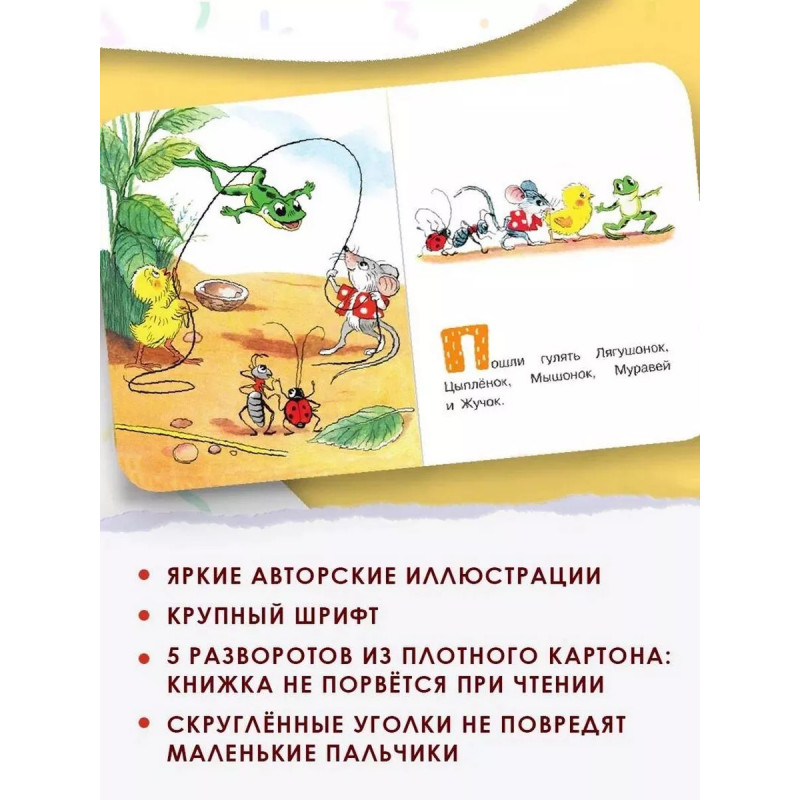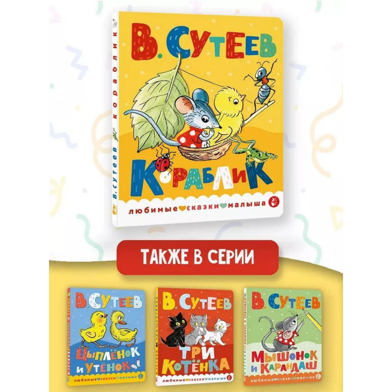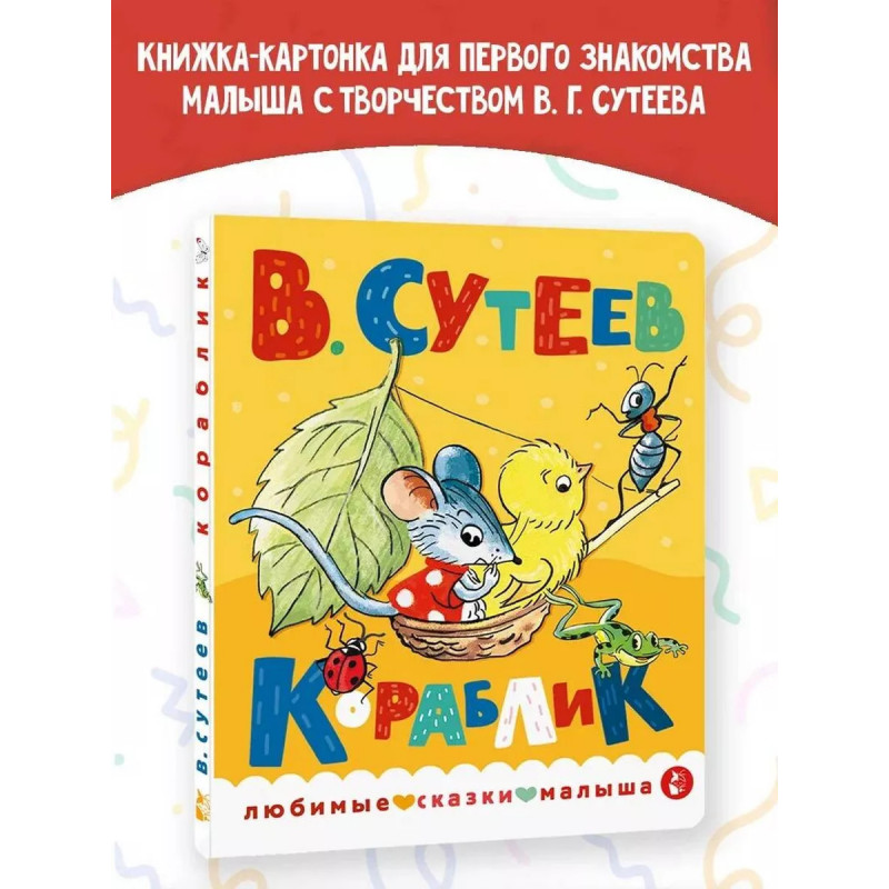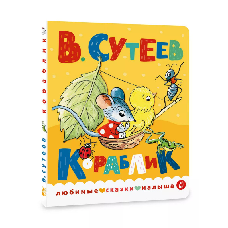 Кораблик. Пошли однажды друзья гулять, пришли на речку - тут-то и оказалось, что плавать из них умеет только Лягушонок. Но Цыплёнок, Мышонок, Муравей и Жучок не расстроились и быстро придумали выход! А что они сделали и как им помогла дружба, вы узнаете из этой книжки! Владимир Григорьевич Сутеев - классик отечественной детской литературы. Его сказки - простые, понятные, но по-своему увлекательные - особенно интересны самым маленьким читателям. Ведь почти каждая фраза в них сопровождается рисунком, и историю можно проследить по картинкам. Эта книга предназначена именно для малышей: в ней яркие рисунки и крупные буквы, плотный картон не порвется при чтении, а скругленные уголки не повредят маленькие пальчики.