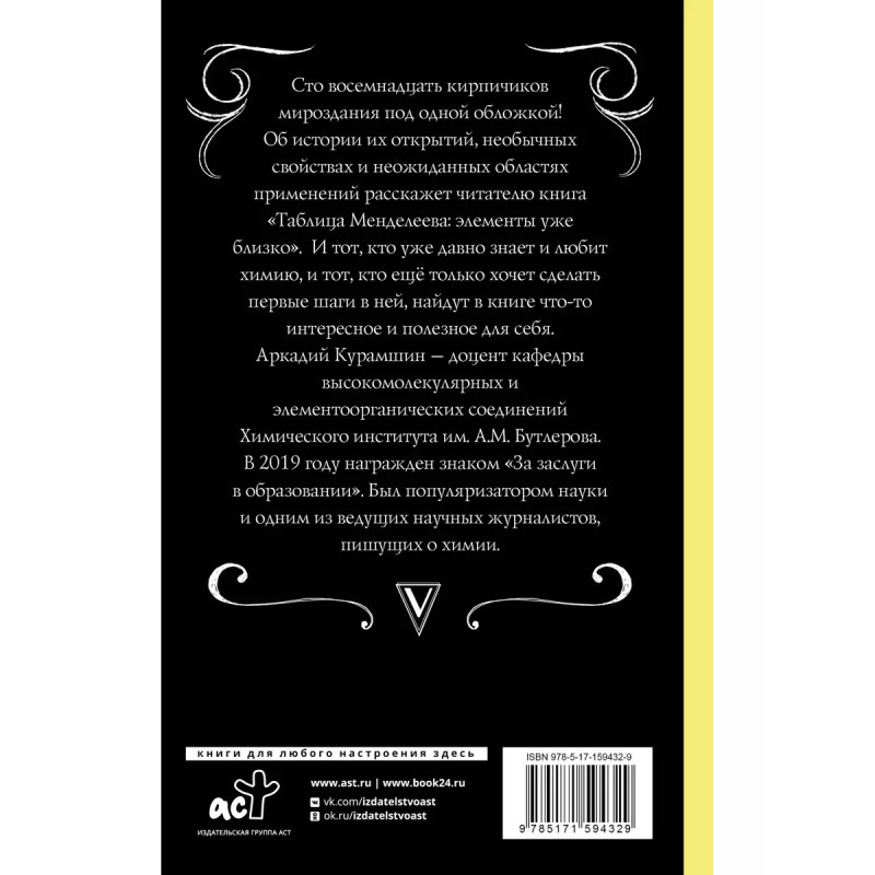 Таблица Менделеева: элементы уже близко. Сто восемнадцать кирпичиков мироздания под одной обложкой! Об истории их открытий, необычных свойствах и неожиданных областях применений расскажет читателю книга "Таблица Менделеева: элементы уже близко". И тот, кто уже давно знает и любит химию, и тот, кто ещё только хочет сделать первые шаги в ней, найдут в книге что-то интересное и полезное для себя. Аркадий Курамшин - доцент кафедры высокомолекулярных и элементоорганических соединений Химического института им. А.М.Бутлерова. В 219 году награжден знаком "За заслуги в образовании". Был популяризатором науки и одним из ведущих научных журналистов, пишущих о химии.