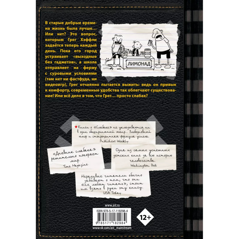 Дневник слабака-10. Как в старые добрые времена. В старые добрые времена жизнь была лучше Или нет? Это вопрос, которым Грег Хэффли задаётся теперь каждый день. Пока его город устраивает "выходные без гаджетов", а школа отправляет на ферму с суровыми условиями (там нет ни фастфуда, ни видеоигр), Грег отчаянно пытается выжить: ведь он привык к комфорту, современные удобства так облегчают существование! Или всё дело в том, что Грег просто слабак?