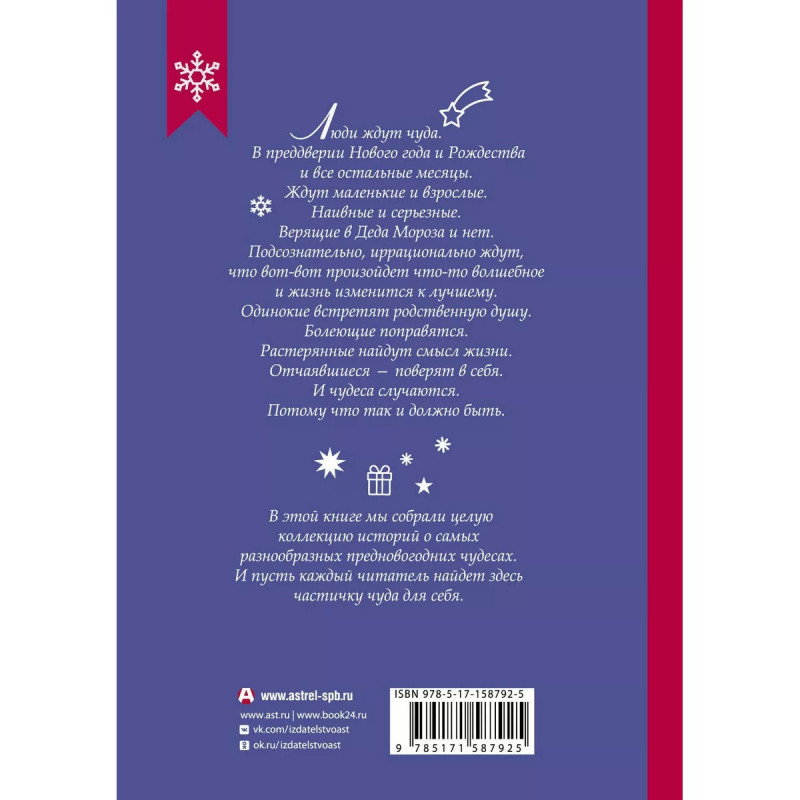 Новогодние рассказы о чуде. Совершенно новый сборник новогодних рассказов от мастеров жанра короткой прозы в очаровательном тематическом оформлении. Часть средств от продажи сборника перечисляются в помощь детям, нуждающимся в лечении, малоимущим семьям и учреждениям для детей-сирот. Настоящая находка для тех, кто не перестает верить в чудеса.