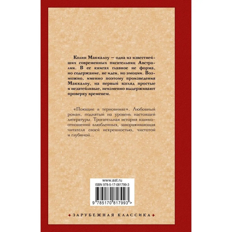 "Поющие в терновнике". Любовный роман, поднятый на уровень настоящей литературы. Трогательная история взаимоотношений влюбленных, завораживающая читателя своей искренностью, чистотой и глубиной...