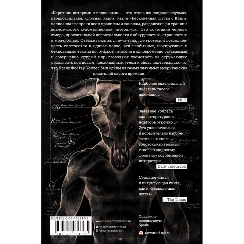 Короткие интервью с подонками. "Короткие интервью с подонками" - это столь же непредсказуемая, парадоксальная, сложная книга, как и "Бесконечная шутка". Книга, написанная вопреки всем правилам и канонам, раздвигаюшая границы возможностей художественной литературы. Это сочетание черного юмора, пронзительной исповедальности с абсурдностью, странностью и мрачностью. Отваживаясь заглянуть туда, где гротеск и повседневность сплетаются в единое целое, эти необычные, шокирующие и откровенные тексты погружают читателя в одновременно узнаваемый и совершенно чуждый мир, позволяют посмотреть на окружающую реальность под новым, неожиданным углом и снова подтверждают то, что Дэвид Фостер Уоллес был одним из самых значимых американских писателей своего времени.
