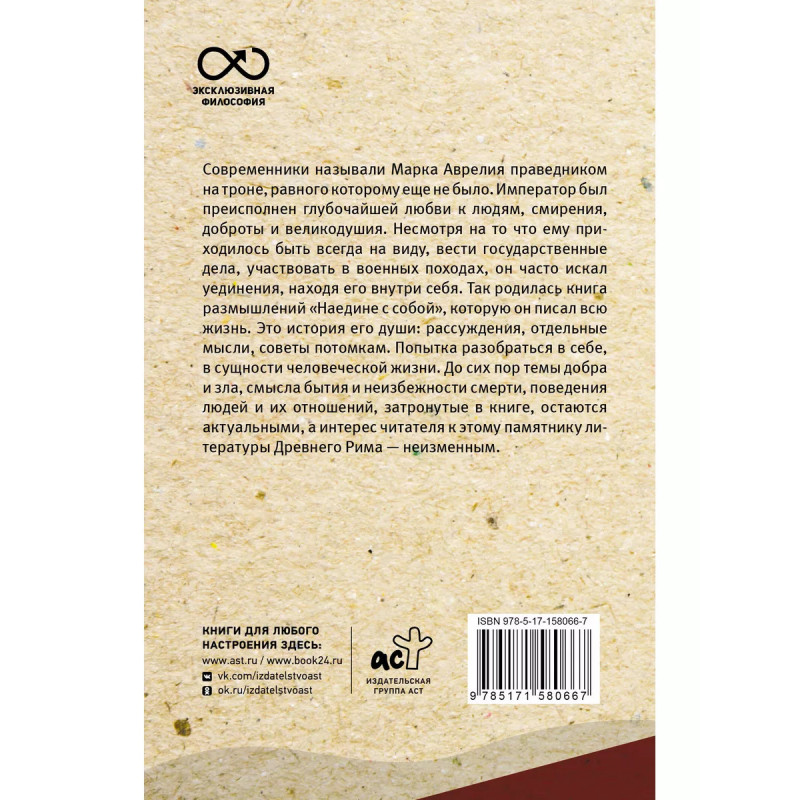 Наедине с собой. С комментариями и иллюстрациями. Современники называли Марка Аврелия праведником на троне, равного которому еще не было. Император был преисполнен глубочайшей любви к людям, смирения, доброты и великодушия. Несмотря на то что ему приходилось быть всегда на виду, вести государственные дела, участвовать в военных походах, он часто искал уединения, находя его внутри себя. Так родилась книга размышлений "Наедине с собой", которую он писал всю жизнь. Это история его души: рассуждения, отдельные мысли, советы потомкам. Попытка разобраться в себе, в сущности человеческой жизни. До сих пор темы добра и зла, смысла бытия и неизбежности смерти, поведения людей и их отношений, затронутые в книге, остаются актуальными, а интерес читателя к этому памятнику литературы Древнего Рима - неизменным.