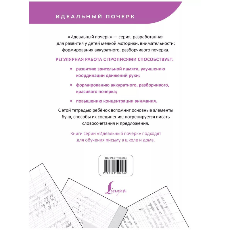 С нуля до каллиграфического почерка. Это пособие поможет поможет ребёнку сформировать аккуратный, разборчивый почерк и избежать распространённых проблем на письме. Издание построено по принципу "от простого к сложному": вначале предлагается вспомнить составные элементы, затем - потренироваться в соединении букв и в итоге - научиться уверенно писать предложения. Прописи соответствуют требованиям ФГОС (Федерального государственного образовательного стандарта) и подходят к любым учебникам русского языка. Издание предназначено для младших школьников, учителей и родителей.