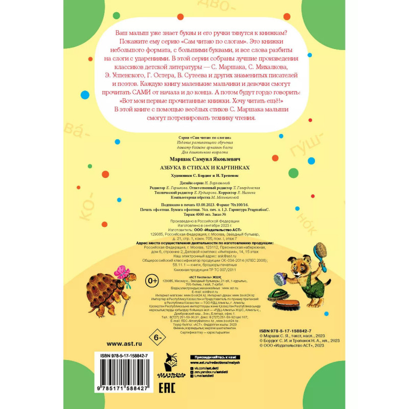 Азбука в стихах и картинках. Крупный шрифт, разбивка на слоги, ударения, запоминающиеся цветные иллюстрации - в книгах серии "Сам читаю по слогам" есть всё необходимое для формирования у ребенка прочного навыка чтения и стимулирования устойчивого интереса к книге. А еще это прекрасная возможность познакомиться с лучшими произведениями любимых детских авторов, многие из которых стали неотъемлемой частью отечественной культуры. Знать их - признак образованного, культурного человека. Идеальное сочетание "цена-качество! Книги не будут обременительны для семейного бюджета и принесут массу пользы, создадут прекрасное настроение. Стихи С. Маршака - лучший способ для тренировки навыка слогового чтения.