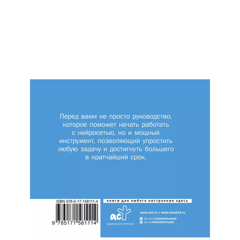 Нейросети ChatGPT, Midjourney. Инструкция для начинающих. Эта книга - руководство, которое представляет собой введение в мир нейросетей и искусственного интеллекта. Вы узнаете, что такое нейросети, как они работают и как применяются в различных областях. Кроме основных принципов в книге также приведены практические советы по использованию нейросетей, рассказано о том, как сделать работу наиболее эффективной и не тратить на это много времени и ресурсов. Подробно рассмотрен процесс создания текстового и графического контента с помощью наиболее популярных нейросертей - ChatGPT, Midjourney и не только. Основная цель книги - познакомить читателей с искусственным интеллектом и нейросетями, объяснить их суть и показать, как они могут быть применены на практике. Она рассчитана на широкую аудиторию, включая тех, кто только начинает свое знакомство с искусственным интеллектом.