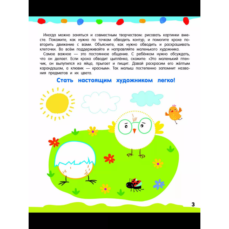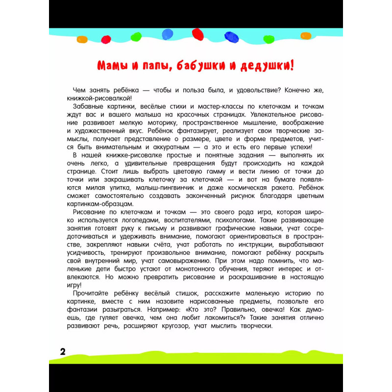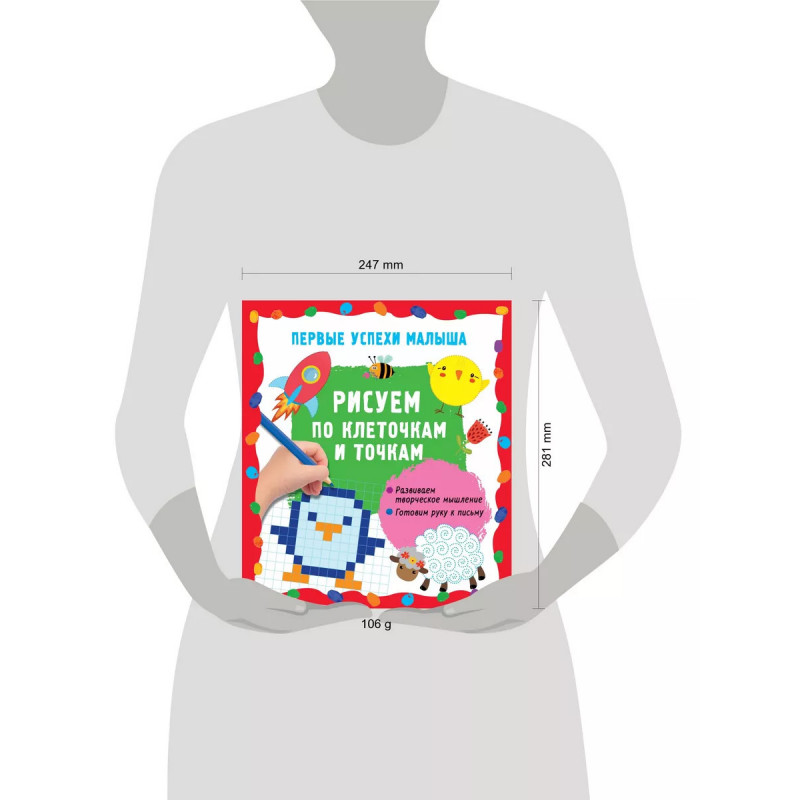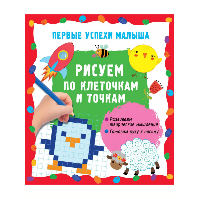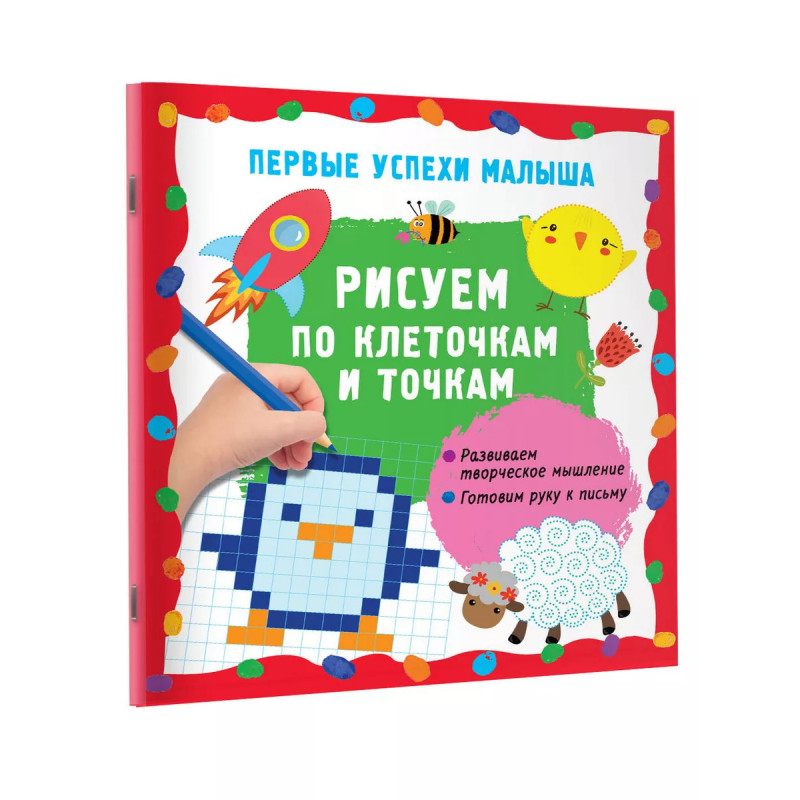 Рисуем по клеточкам и точкам. Рисовать по клеточкам и точкам - это увлекательно, весело и очень полезно: " развиваем речь, мелкую моторику и тактильное восприятие; " знакомим с окружающим миром, формируем познавательный интерес; " стимулируем логическое и образное мышление; " формируем представление о предметах, их цвете, форме и размере; " тренируем зрительную память, концентрацию внимания; " развиваем художественное восприятие; " воспитываем интерес к изобразительному искусству: " улучшаем эмоциональное состояние маленького художника. С нашей книжкой малыш получит удовольствие от творчество и результата: потренирует пальчики, научится правильно держать карандаш, а в дальнейшем - писать красиво и аккуратно!