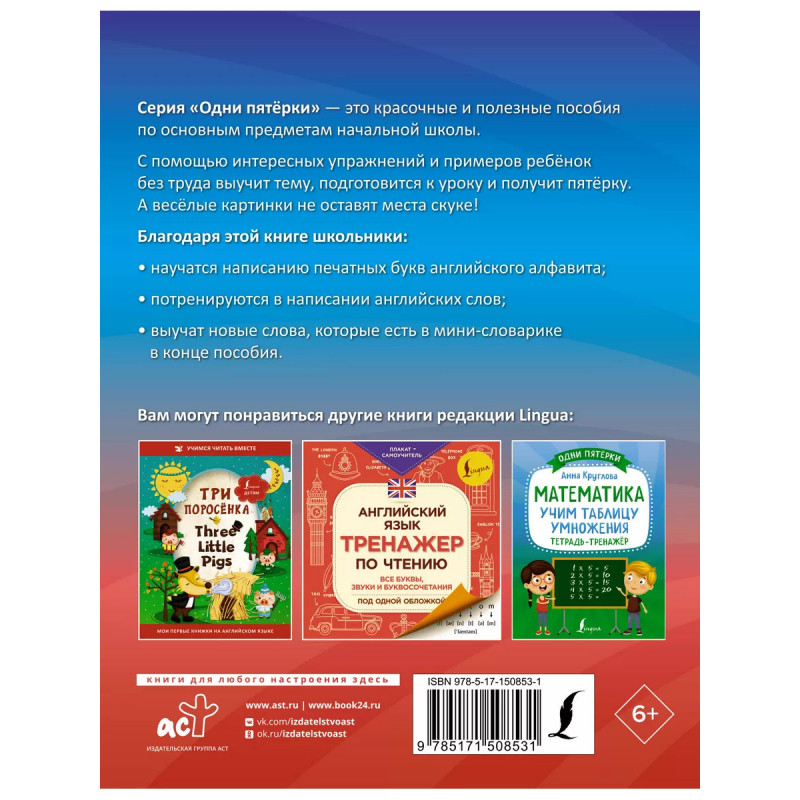 Английский язык: все буквы и буквосочетания. Тетрадь-тренажёр по письму. В пособие вошли прописи по английскому языку, с помощью которых ребёнок сможет потренироваться в написании английских букв и слов. Издание проиллюстрировано яркими картинками, которые вносят игровой элемент в процесс обучения. В конце книги дан мини-словарик для пополнения лексического запаса. Пособие предназначается для учащихся младших классов, а также может быть полезно учителям и родителям для работы в классе и дома.