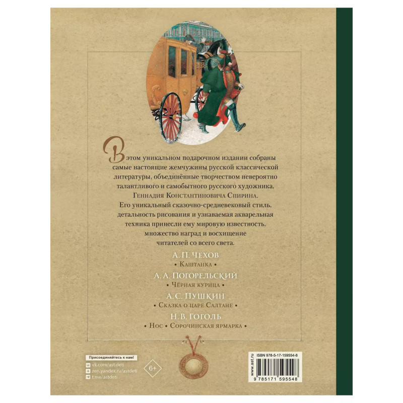 Русская классика в иллюстрациях Геннадия Спирина. В этом уникальном подарочном издании собраны самые настоящие жемчужины русской классической литературы, объединенные творчеством невероятно талантливого и самобытного русского художника, Геннадия Константиновича Спирина. Его уникальный сказочно-средневековый стиль, детальность рисования и узнаваемая акварельная техника принесли ему мировую известность,множество наград и восхищение читателей со всего света.