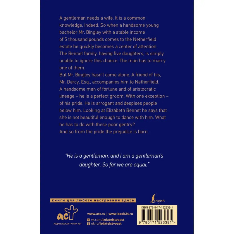 Гордость не позволяет вам читать английские книги в адаптации? Предубеждены против сокращений? Тогда ознакомьтесь с шедевром Джейн Остен в оригинале! "Гордость и предубеждение" роман нравов, рассказывающий о неравной любви аристократа и девушки из семьи небогатого дворянина, которому отчаянно необходимо пристроить куда-нибудь пять своих дочерей. Эта история любви вот уже два столетия находит себе преданных поклонников. Впрочем, не последнюю роль в этом играет мягкий юмор Д. Остен, её неповторимая авторская черта. Джейн Остен одна из первых английских писательниц и по значению, и по хронологии. Слог её изящен и ироничен. Хотя она росла в том же мире сословных предрассудков конца XIX в., что и её герои, она легко возносится над ним. Облик этого общества, сатира над которым начинается буквально с первого предложения романа, Д. Остен выписала тщательно и с большой любовью. Сюжет книги не так уж сложен, но это с лихвой восполняет её мастерское владение стилем. Книга издана в неадаптированной версии. Наслаждайт