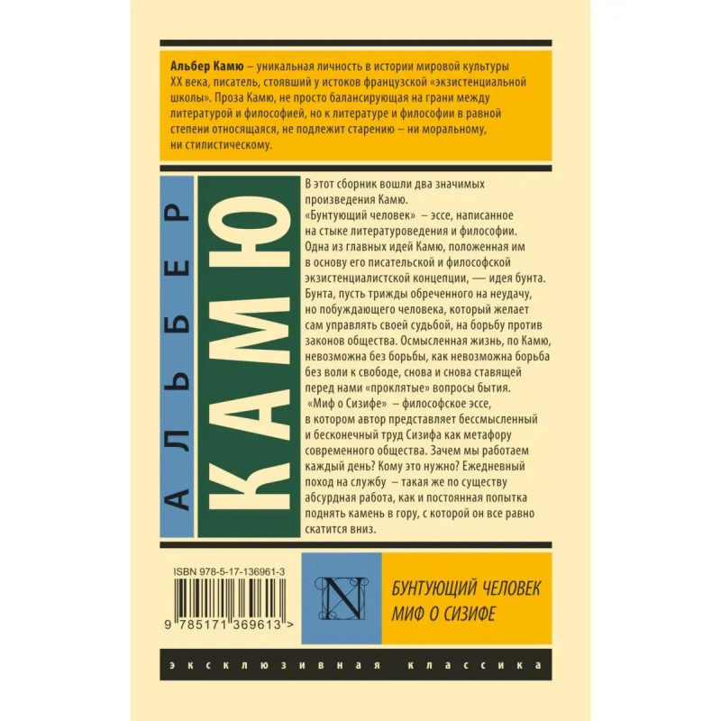 В этот сборник вошли два значимых произведения Камю. "Бунтующий человек" эссе, написанное на стыке литературоведения и философии. Одна из главных идей Камю, положенная им в основу его писательской и философской экзистенциалистской концепции, идея бунта. Бунта, пусть трижды обреченного на неудачу, но побуждающего человека, который желает сам управлять своей судьбой, на борьбу против законов общества. Осмысленная жизнь, по Камю, невозможна без борьбы, как невозможна борьба без воли к свободе, снова и снова ставящей перед нами "проклятые" вопросы бытия. "Миф о Сизифе" философское эссе, в котором автор представляет бессмысленный и бесконечный труд Сизифа как метафору современного общества. Зачем мы работаем каждый день? Кому это нужно? Ежедневный поход на службу такая же по существу абсурдная работа, как и постоянная попытка поднять камень в гору, с которой он все равно скатится вниз.