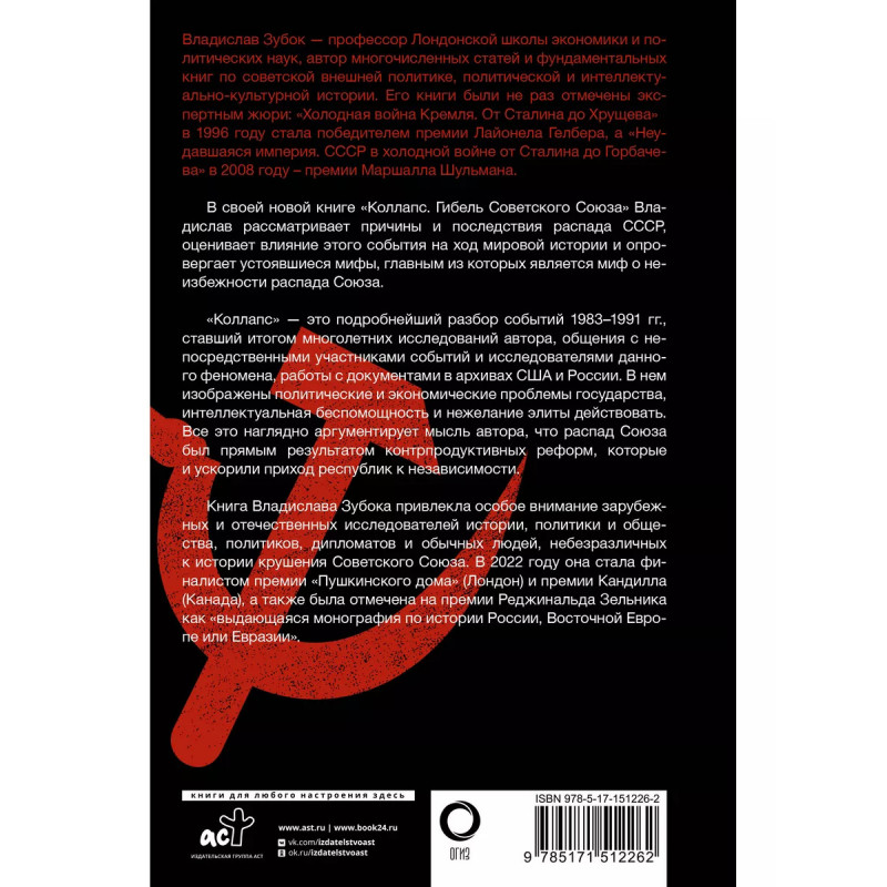 Коллапс. Гибель Советского Союза. Владислав Зубок - профессор Лондонской школы экономики и политических наук - в своей книге "Коллапс. Гибель Советского Союза" рассматривает причины и последствия распада СССР, оценивает влияние этого события на ход мировой истории и опровергает устоявшиеся мифы, главным из которых является миф о неизбежности распада Союза. "Коллапс" - это подробнейший разбор событий 1983-1991 гг., ставший итогом многолетних исследований автора, общения с непосредственными участниками событий и исследователями данного феномена, работы с документами в архивах США и России. В нем изображены политические и экономические проблемы государства, интеллектуальная беспомощность и нежелание элиты действовать. Все это наглядно аргументирует мысль автора, что распад Союза был прямым результатом контрпродуктивных реформ, которые ускорили приход республик к независимости.