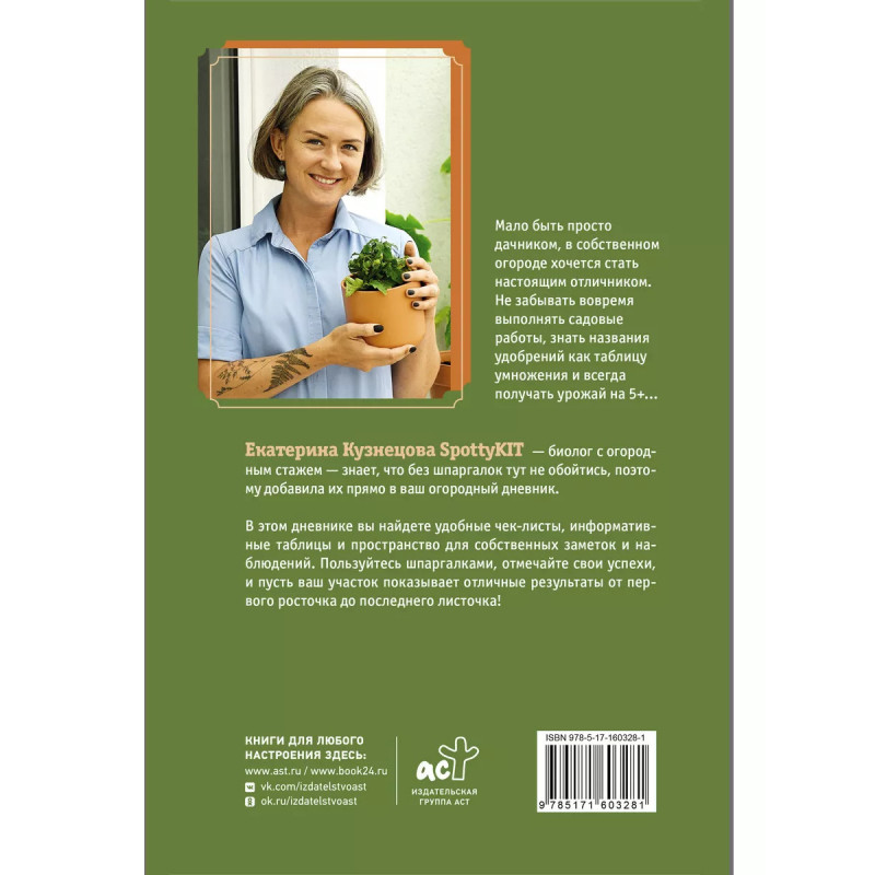 Огородный дневник уДачника. Любите огород, но сложно не запутаться в сроках посадки, сортах семян и уходе за рассадой? Начните вести "Огородный дневник удачника", и тогда все наработки в саду станут на свои места. Профессиональный биолог, садовод с 10-летним опытом, автор бестселлеров "Растущие в темноте" и "Сад. Огород. Цветник" Екатерина Кузнецова, создала новое пособие "Огородный дневник удачника".