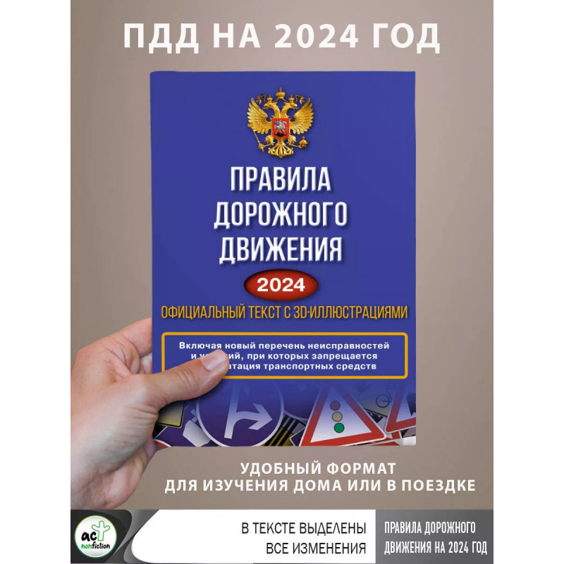 Правила дорожного движения на 2024 год. Официальный текст с 3D иллюстрациями. Включая новый перечень. Издание содержит официальный текст Правил дорожного движения со всеми последними изменениями и дополнениями на 2024 год, включая новый перечень неисправностей и условий, при которых запрещается эксплуатация транспортных средств. Для удобства читателей все последние изменения выделены полужирным и зеленым шрифтом. Книга проиллюстрирована примерами дорожных ситуаций, которые помогут будущим водителям лучше ориентироваться на дорогах. Издание учитывает все изменения, опубликованные в официальных источниках на момент подписания издания в печать.