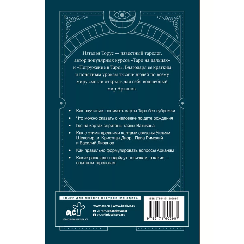 Тонкости Таро. Символика, архетипы и скрытые смыслы. Хотите не просто научиться гадать на картах Таро, а проникнуть в глубинный смысл каждого Аркана этой древней колоды? Хотите понять историю, символику, культурные связи Таро, но не хотите перегружать мозг громоздкой теорией и перечислением всевозможных значений карт? Хотите узнать, как карты Таро могут применяться в работе психолога? Наталья Торус - известный таролог, автор популярных курсов "Таро на пальцах" и "Погружение в Таро". Благодаря ее кратким и понятным урокам тысячи людей по всему миру смогли открыть для себя волшебный мир Арканов. В книге нет скучной теории или громоздких толкований! На Арканах Таро уживаются и мирно соседствуют древнегреческая мифология и восточная философия, христианская символика и еврейский алфавит, алхимия и астрология, нумерология и каббала. Колода Таро - это настоящий кладезь знаний, а также источник вдохновения и материал для творчества. Именно так, к примеру, воспринимал эти большие красивые карты выдающийся психиатр Карл Густав Юнг. Швейцарский ученый был хорошо знаком с