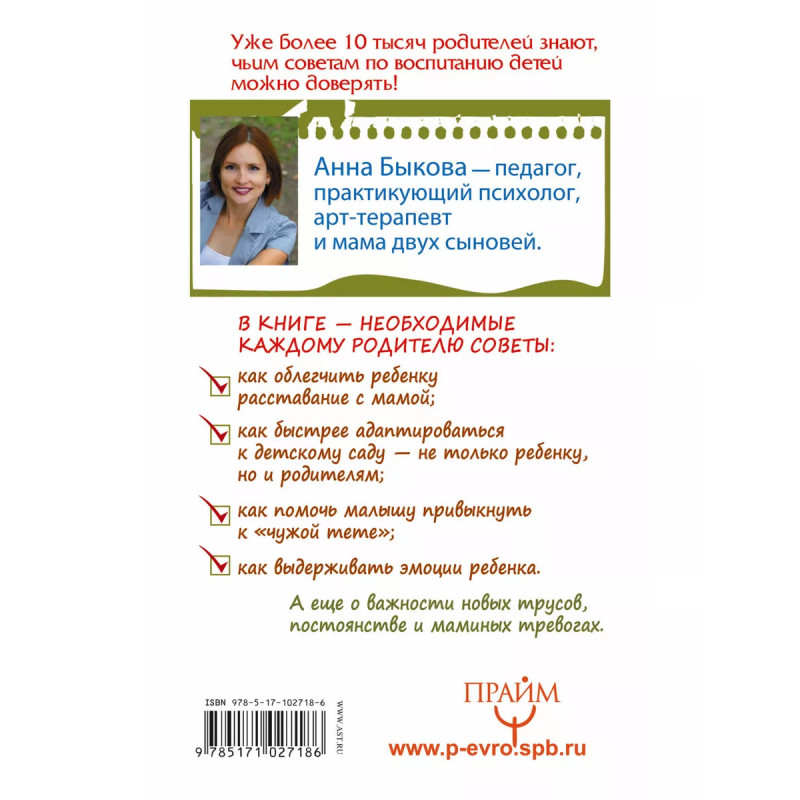 Мой ребенок с удовольствием ходит в детский сад!. Анна Быкова - талантливый педагог, практикующий психолог, мама двух сыновей, ее советам по воспитанию доверяют более 10 тысяч родителей! В этой книге вы найдете ответы на очень важные вопросы, от которых зависит - ни много ни мало - счастье ребенка, его нормальное психическое развитие: - как облегчить ребенку расставание с мамой; - как быстрее адаптироваться к детскому саду - не только ребенку, но и родителям; - как научиться спокойно реагировать на детские слезы, истерики, отсутствие аппетита, нежелание оставаться с "чужой тетей"; - что на самом деле происходит с ребенком в детском саду. А еще о важности новых трусов, постоянстве и маминых тревогах. Практический опыт, реальные истории, бесценные советы!