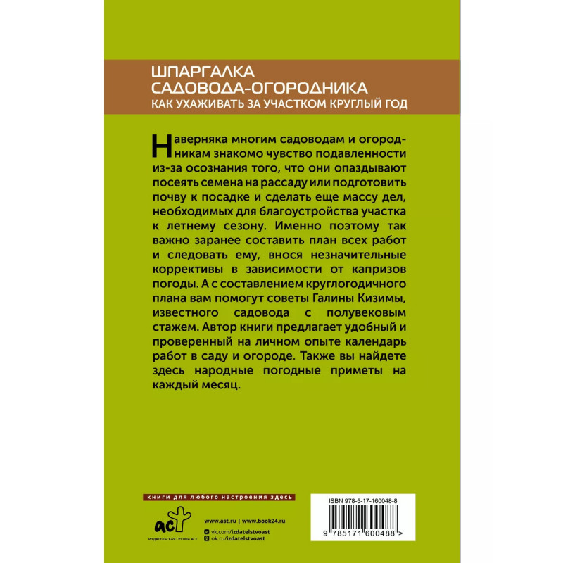 Шпаргалка садовода-огородника. Как ухаживать за участком круглый год. Наверняка многим садоводам и огородникам знакомо чувство подавленности из-за осознания того, что они опаздывают посеять семена на рассаду или подготовить почву к посадке и сделать еще массу дел, необходимых для благоустройства участка к летнему сезону. Именно поэтому так важно заранее составить план всех работ и следовать ему, внося незначительные коррективы в зависимости от капризов погоды. А с составлением круглогодичного плана вам помогут советы Галины Кизимы, известного садовода с полувековым стажем. Автор книги предлагает удобный и проверенный на личном опыте календарь работ в саду и огороде. Также вы найдете здесь народные погодные приметы на каждый месяц.