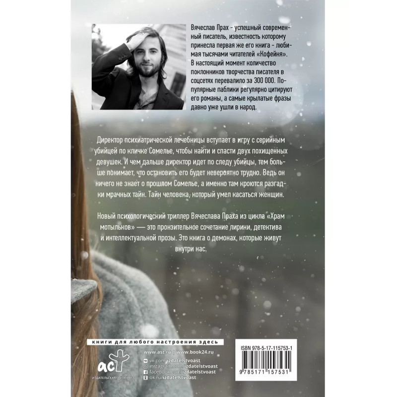 Он умел касаться женщин. Директор психиатрической лечебницы вступает в игру с серийным убийцей по кличке Сомелье, чтобы найти и спасти двух похищенных девушек. И чем дальше директор идет по следу убийцы, тем больше понимает, что остановить его будет невероятно трудно. Ведь он ничего не знает о прошлом Сомелье, а именно там кроются разгадки мрачных тайн. Тайн человека, который умел касаться женщин. Новый психологический триллер Вячеслава Праха из цикла "Храм мотыльков" - это пронзительное сочетание лирики, детектива и интеллектуальной прозы. Это книга о демонах, которые живут внутри нас.