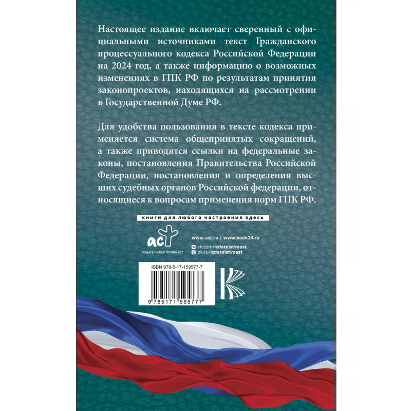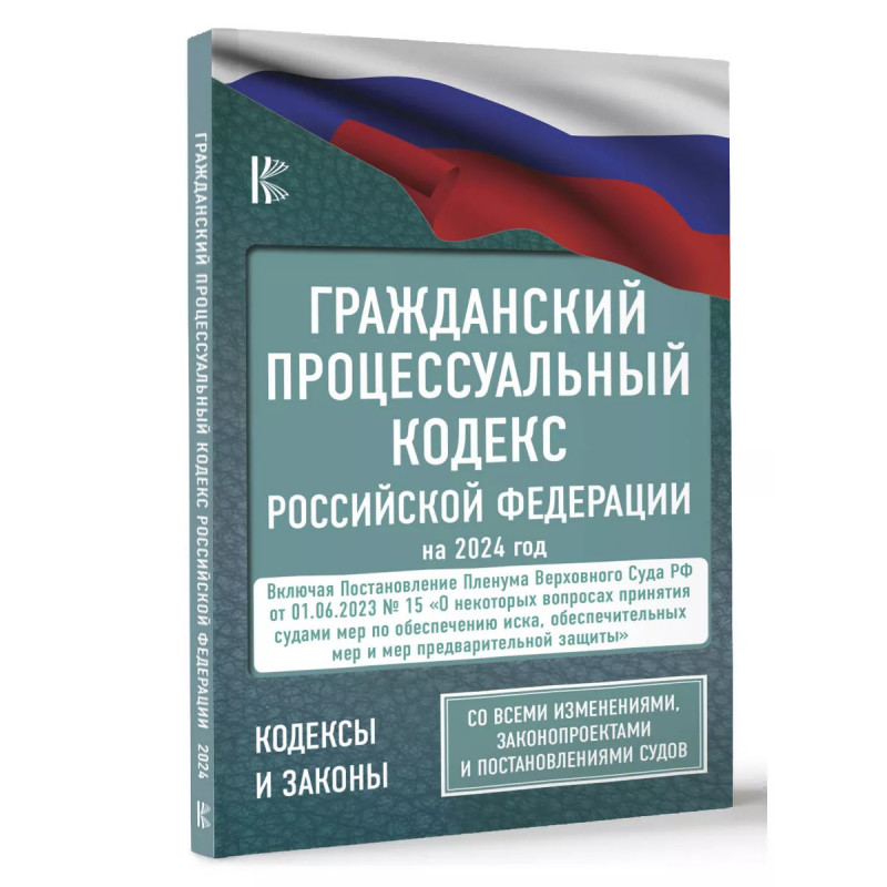 Гражданский процессуальный кодекс Российской Федерации на 2024 год + Постановление Пленума ВС РФ от . Данное издание Гражданского процессуального кодекса Российской Федерации сверено с официальным источником и приводится по состоянию на 2024 год. Кодекс учитывает все изменения, опубликованные в официальных источниках на момент подписания издания в печать. Дополнительно издание включает Постановление Пленума Верховного Суда РФ от 01(точка)06.2023 № 15 "О некоторых вопросах принятия судами мер по обеспечению иска, обеспечительных мер и мер предварительной защиты", а также информацию о возможных изменениях ГПК РФ по результатам принятия законопроектов, находящихся на рассмотрении в Государственной Думе РФ. Для более удобного использования в тексте кодекса применяется система сокращенного написания отдельных слов и выражений, а также приводятся ссылки на федеральные законы, постановления и определения высших судебных органов Российской Федерации, относящиеся к вопросам применения норм гражданского процесса.