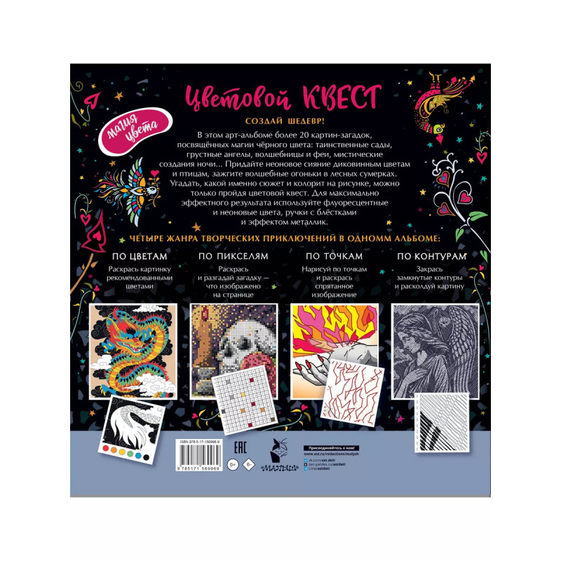 Чёрно-белая магия. Долгожданная арт-раскраска для детей. Все самые популярные арт-квесты в одном издании. "Цветовой квест" - серия альбомов для креативного раскрашивания. Наконец и у детей появилось издание для увлекательного творческого досуга. В каждой книге объединены и адаптированы для детей жанры любимых арт-квестов для взрослых: раскраски по номерам, по пикселям, по точкам. В этом арт-альбоме более 20 картин-загадок в любимых жанрах: анималистика, пейзаж, натюрморт. Угадать, какой именно сюжет на рисунке можно только пройдя цветовой квест. Разгадайте скрытые картины, наполняя изображения цветом. ТРИ ЖАНРА ТВОРЧЕСКИХ ПРИКЛЮЧЕНИЙ В ОДНОМ АЛЬБОМЕ: - ПО ПИКСЕЛЯМ - Раскрась и разгадай загадку - что изображено на странице - ПО НОМЕРАМ - Раскрась картинку сочными контрастными цветами цветовой палитры - ПО ТОЧКАМ - Нарисуй по точкам и раскрась спрятанное изображение.