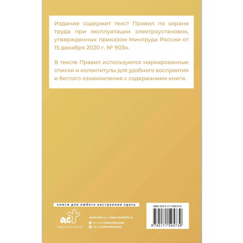 Новые правила по охране труда при эксплуатации электроустановок. Издание содержит текст Правил по охране труда при эксплуатации электроустановок, утвержденных приказом Минтруда России от 15 декабря 2020 г. № 903н. В тексте Правил используются маркированные списки и колонтитулы для удобного восприятия и беглого ознакомления с содержанием книги. Издание учитывает все изменения, опубликованные в официальных источниках на момент подписания издания в печать.