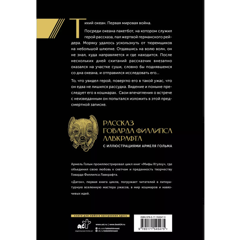 Дагон с иллюстрациями Армеля Гольма. - Специальное издание культового рассказа Говарда Лавкрафта с иллюстрациями французского художника и графического дизайнера Армеля Гольма. - Необычный авторский стиль: черно-белые рисунки выполнены как заметки и зарисовки путешественника, исследующего жуткий и загадочный лавкрафтианский мир. - Улучшенное оформление: стильная черная суперобложка, тиснение золотом и лента-ляссе.