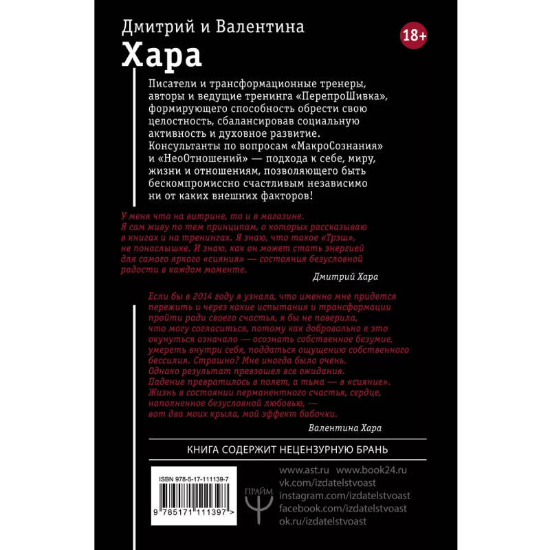 Сияние. #Любовь без условностей. Эта книга - о любви, о том, что будоражит сердце каждого человека. Ничто не ранит так больно, как отсутствие взаимопонимания, желание самоутвердится или эгоизм в отношениях. "Сияние" - продолжение скандально известной книги Дмитрия и Валентины Хары "Трэш"; кульминация развития истинной любви. Новая книга авторов дает ответы на самые личные вопросы о себе и об отношениях, о том, что делает нас счастливыми или несчастными. От страницы к странице авторы проведут вас в мир отношений, которые наполняют, радуют, позволяют раскрыться каждому партнеру. Возможно, кто-то посчитает историю героев слишком интимной, но в этом и вся соль: показать жизнь без прикрас и путь, пусть и тернистый, к тому, что можно назвать безусловной любовью.