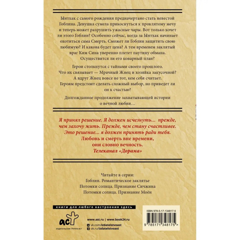 Ынтхак с самого рождения предначертано стать невестой Гоблина. Девушка сумела прикоснуться к проклятому мечу и теперь может разрушить ужасные чары. Вот только хочет ли этого Гоблин? Особенно сейчас, когда за Ынтхак начинает охотиться сама Смерть. Сможет ли Гоблин защитить свою любимую? И какова будет цена? А тем временем заклятый враг Ким Сина уверенно плетет паутину обмана. Осуществится ли его коварный план? Герои столкнутся с тайнами своего прошлого. Что их связывает Мрачный Жнец и хозяйка закусочной? А вдруг Жнец вовсе не тот, кем себя считает? Героям предстоит сделать сложный выбор, но приведет ли он к счастью? Долгожданное продолжение захватывающей истории о вечной любви
