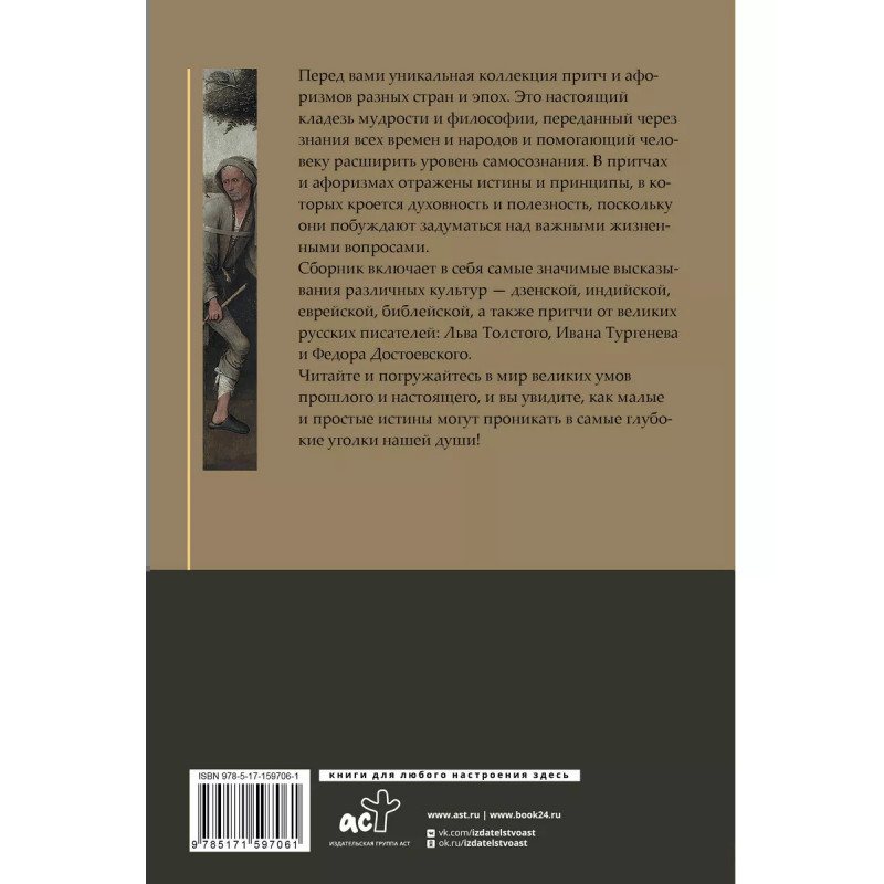 Притчи и афоризмы: знания всех времен и народов. Перед вами уникальная коллекция притч и афоризмов разных стран и эпох. Это настоящий кладезь мудрости и философии, переданный через знания всех времен и народов и помогающий человеку расширить уровень самосознания. В притчах и афоризмах отражены истины и принципы, в которых кроется духовность и полезность, поскольку они побуждают задуматься над важными жизненными вопросами. Сборник включает в себя самые значимые высказывания различных культур - дзенской, индийской, еврейской, библейской, а также притчи от великих русских писателей: Льва Толстого, Ивана Тургенева и Федора Достоевского. Читайте и погружайтесь в мир великих умов прошлого и настоящего, и вы увидите, как малые и простые истины могут проникать в самые глубокие уголки нашей души!