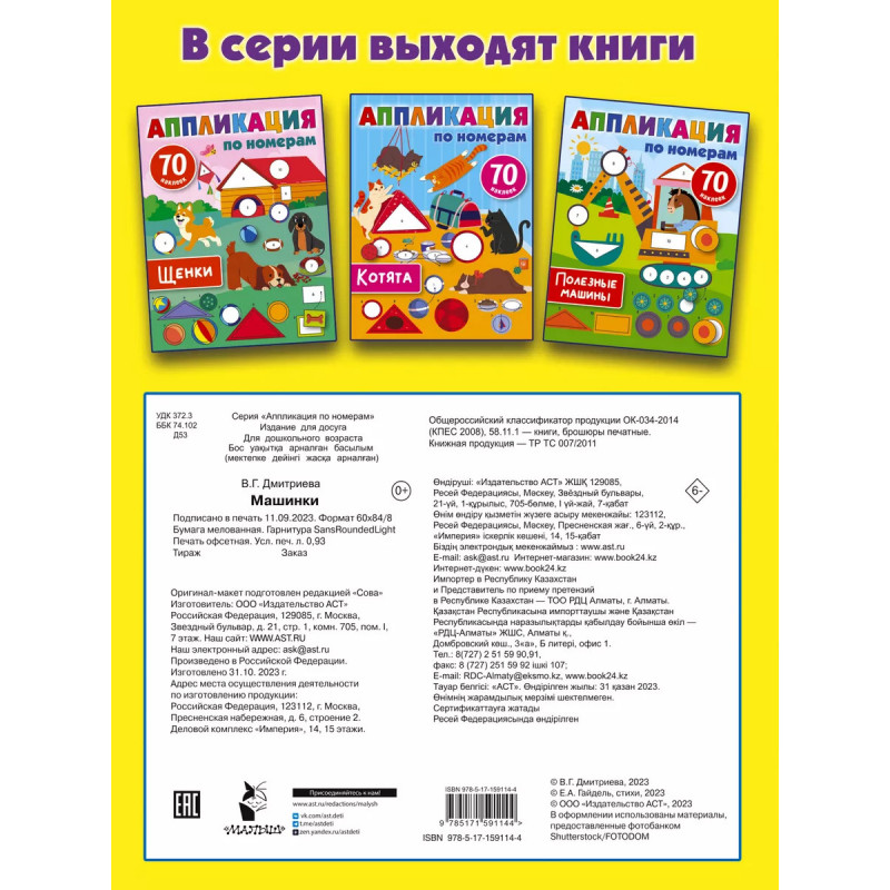 Машинки. Чтобы создать красивую аппликацию, достаточно купить нашу книгу "Машинки". Ребёнку не потребуются ножницы, клей и набор цветной бумаги. Находишь наклейки с определённым номером, приклеиваешь их - и чудесная картинка готова. Но это ещё не всё! Увлечённый творческим процессом малыш сам не заметит, как выучит цифры, геометрические фигуры, получит представление о понятиях "больше-меньше", "ближе-дальше", "выше-ниже", а также потренирует мелкую моторику, внимание и память. Аппликации с милыми зверюшками-водителями понравятся всем!
