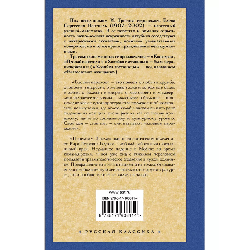 Вдовий пароход. Перелом. "Вдовий пароход" - это повесть о любви и дружбе, о юности и старости, о женской доле и конфликте отцов и детей, о болезни и смерти, о жестокости и милосердии: человеческие драмы - маленькие и большие - происходят в замкнутом пространстве послевоенной московской коммуналки, где волею судьбы оказались пять рано овдовевших женщин, очень разных как по своему прошлому, так и по социальному и культурному уровню. Свой дом - свой мир - они называют "вдовьим пароходом". "Перелом". Заведующая терапевтическим отделением Кира Петровна Реутова - добрый, заботливый и отзывчивый врач. Неудачное падение в Москве во время командировки, и вот уже она с тяжелым переломом попадает в травматологическое отделение в чужой больнице. Превращение из врача в пациента не только открывает для нее больничную действительность с другого ракурса, но и вообще меняет ее взгляд на жизнь.