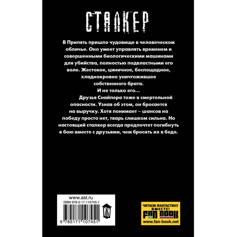 Закон Припяти. В Припять пришло чудовище в человеческом обличье. Оно умеет управлять временем и совершенными биологическими машинами для убийства, полностью подвластными его воле. Жестокое, циничное, беспощадное, хладнокровно уничтожившее собственного брата. И не только его Друзья Снайпера тоже в смертельной опасности. Узнав об этом, он бросается на выручку. Хотя понимает - шансов на победу просто нет, тварь слишком сильна. Но настоящий сталкер всегда предпочтет погибнуть в бою вместе с друзьями, чем бросить их в беде.