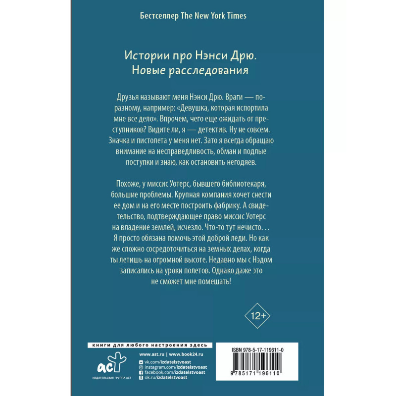 Нэнси Дрю и рискованное дело. Друзья называют меня Нэнси Дрю. Враги - по-разному, например: "Девушка, которая испортила мне все дело". Впрочем, чего еще ожидать от преступников? Видите ли, я - детектив. Ну не совсем. Значка и пистолета у меня нет. Зато я всегда обращаю внимание на несправедливость, обман и подлые поступки и знаю, как остановить негодяев. Похоже, у миссис Уотерс, бывшего библиотекаря, большие проблемы. Крупная компания хочет снести ее дом и на его месте построить фабрику. А свидетельство, подтверждающее право миссис Уотерс на владение землей, исчезло. Что-то тут нечисто Я просто обязана помочь этой доброй леди в беде. Но как же сложно сосредоточиться на земных делах, когда ты летишь на огромной высоте. Недавно мы с Нэдом записались на уроки полетов. Однако даже это не сможет мне помешать!