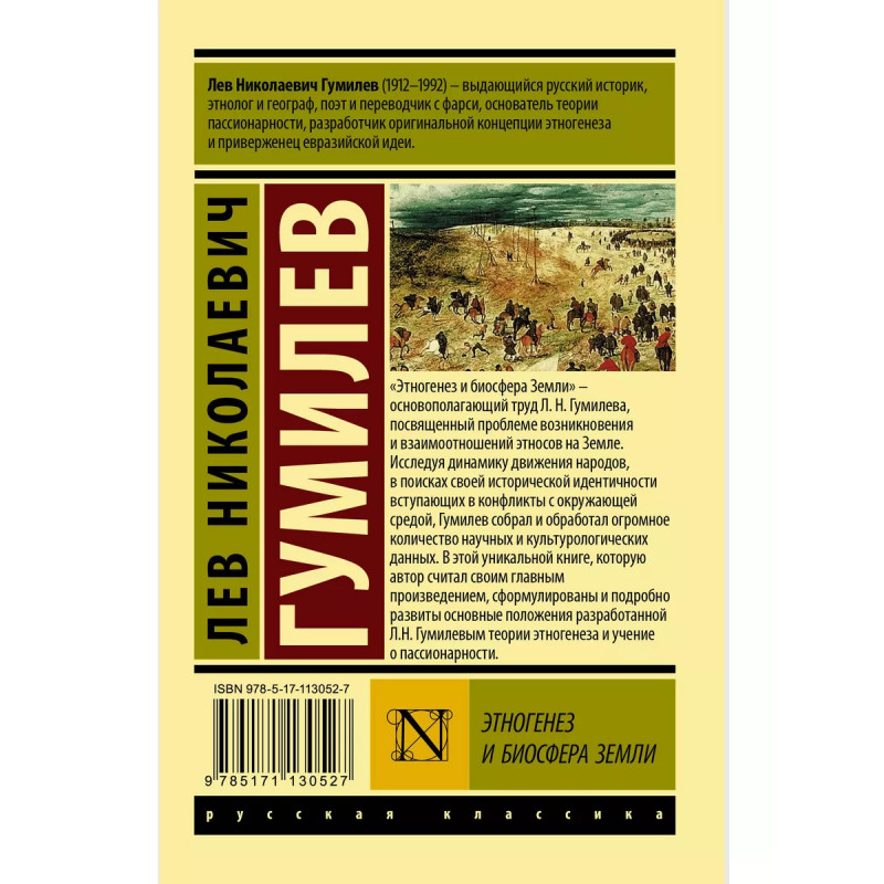 Этногенез и биосфера Земли. "Этногенез и биосфера Земли" - основополагающий труд Л.Н. Гумилева, посвященный проблеме возникновения и взаимоотношений этносов на Земле. Исследуя динамику движения народов, в поисках своей исторической идентичности вступающих в конфликты с окружающей средой, Гумилев собрал и обработал огромное количество научных и культурологических данных. В этой уникальной книге, которую автор считал своим главным произведением, сформулированы и подробно развиты основные положения разработанной Л.Н. Гумилевым теории этногенеза и учение о пассионарности.