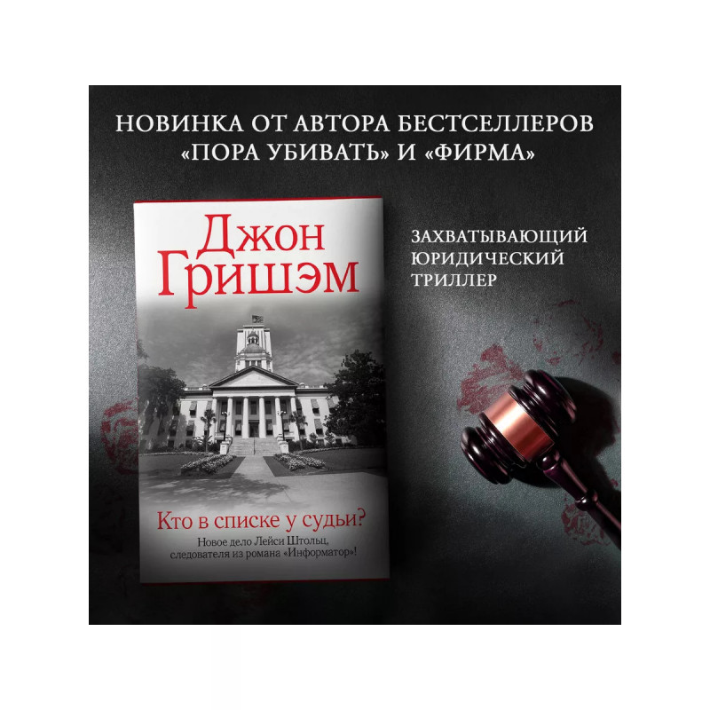 Кто в списке у судьи?. Новый юридический триллер от одного из самых популярных авторов современности. Лейси Штольц уже удалось однажды засадить за решетку судью, получившего крупную взятку от мафиозного синдиката. Но что если на этот раз очередной судья с безупречной репутацией окажется серийным убийцей? Сможет ли Лейси остановить кровавую руку правосудия и спасти невиновных, сохранив при этом собственную жизнь?
