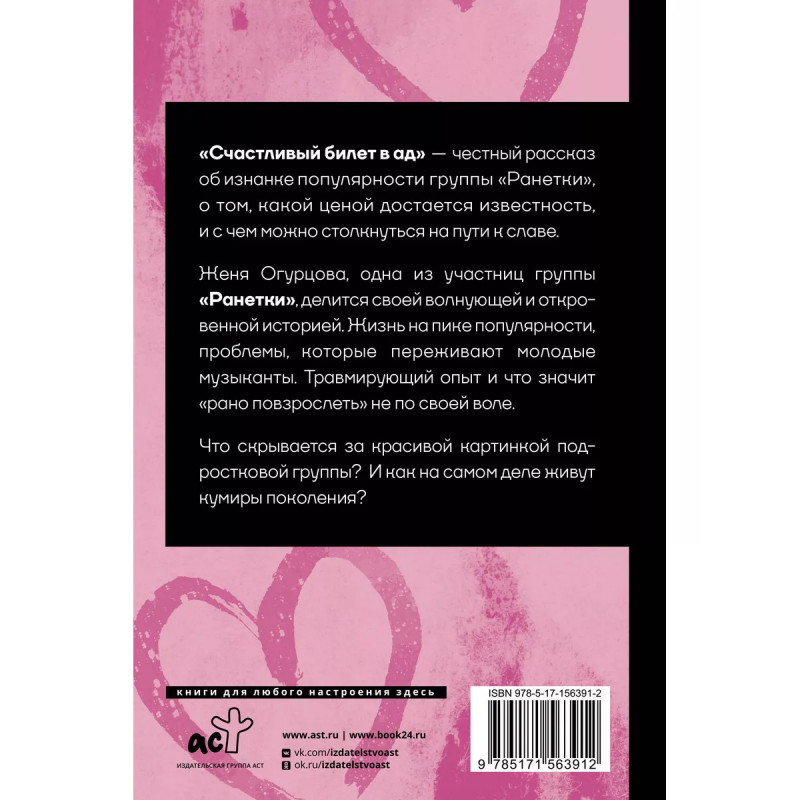 Счастливый билет в ад. "Счастливый билет в ад" - честный рассказ об изнанке популярности группы "Ранетки", о том, какой ценой достается известность, и с чем можно столкнуться на пути к славе. Женя Огурцова, одна из участниц группы "Ранетки", делится своей волнующей и откровенной историей. Жизнь на пике популярности, проблемы, которые переживают молодые музыканты. Травмирующий опыт и что значит "рано повзрослеть" не по своей воле. Что скрывается за красивой картинкой подростковой группы? И как на самом деле живут кумиры поколения?