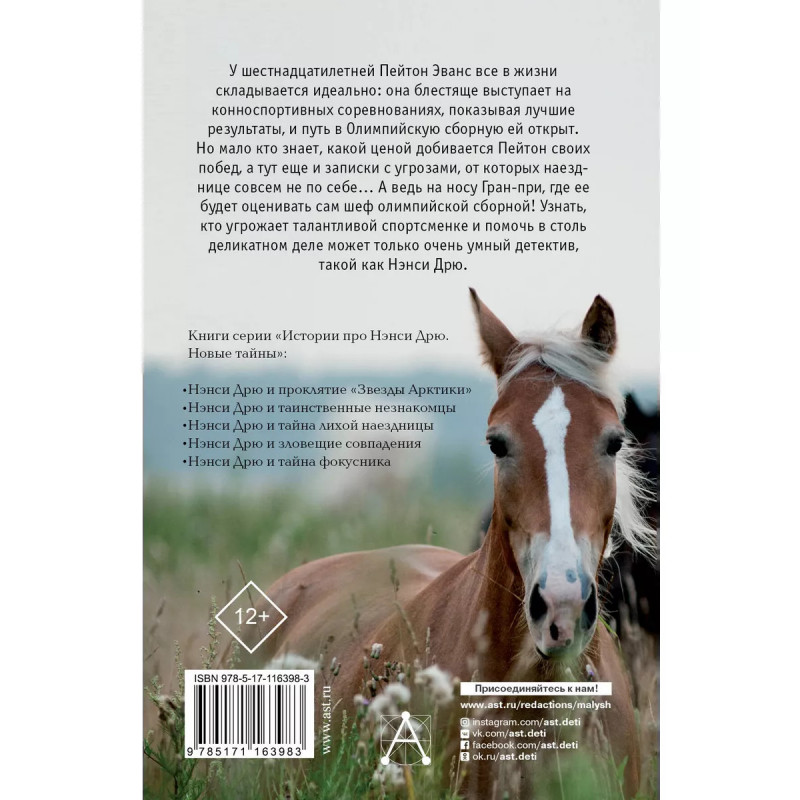 НЭНСИ ДРЮ и тайна лихой наездницы. У шестнадцатилетней Пейтон Эванс все в жизни складывается идеально: она блестяще выступает на конноспортивных соревнованиях, показывая лучшие результаты, и путь в Олимпийскую сборную ей открыт. Но мало кто знает, какой ценой добивается Пейтон своих побед, а тут еще и записки с угрозами, от которых наезднице совсем не по себе А ведь на носу Гран-при, где ее будет оценивать сам шеф олимпийской сборной! Узнать, кто угрожает талантливой спортсменке и помочь в столь деликатном деле может только очень умный детектив, такой как Нэнси Дрю.