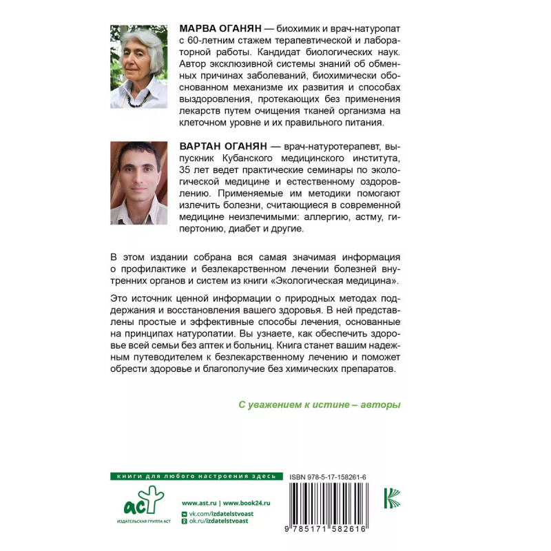 Безлекарственное лечение. Рецепты натуропатии. Марва Оганян - биохимик и врач-натуропат с 6-летним стажем терапевтической и лабораторной работы. Кандидат биологических наук. Автор эксклюзивной системы знаний об обменных причинах заболеваний, биохимически обоснованном механизме их развития и способах выздоровления, протекающих без применения лекарств путем очищения тканей организма на клеточном уровне и их правильного питания. Вартан Оганян - врач-натуротерапевт, выпускник Кубанского медицинского института, 35 лет ведет практические семинары по экологической медицине и естественному оздоровлению. Применяемые им методики помогают излечить болезни, считающиеся в современной медицине неизлечимыми: аллергию, астму, гипертонию, диабет и другие. В этом издании собрана вся самая значимая информация о профилактике и безлекарственном лечении болезней внутренних органов и систем из книги "Экологическая медицина". Это источник ценной информации о природных методах поддержания и восстановления вашего здоровья. В ней представлены простые и эффективные способы лечения,