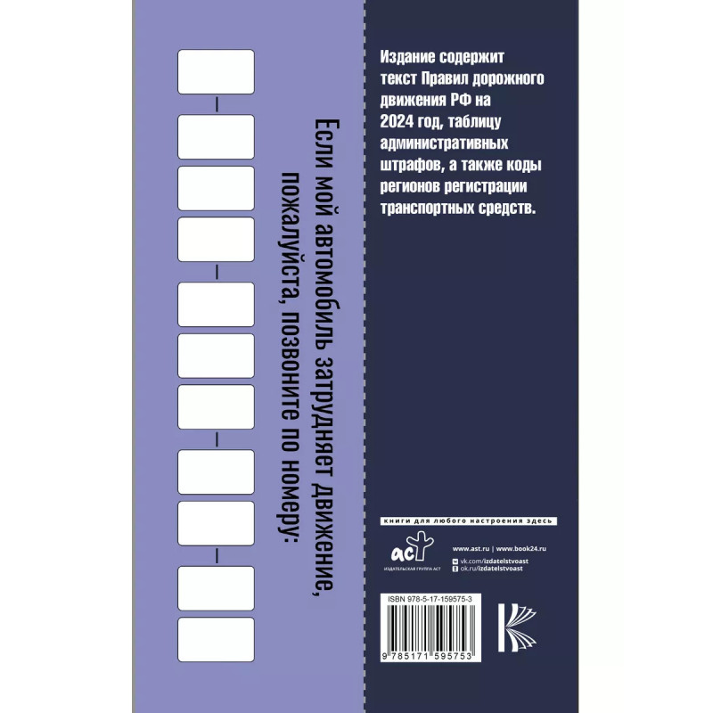 Правила дорожного движения с самыми последними изменениями на 2024 год: штрафы, коды регионов. Включ. Книга содержит официальный текст Правил дорожного движения Российской Федерации на 2024 год, включая правила пользования средствами индивидуальной мобильности (электросамокатами, электроскейтбордами, гироскутерами, сигвеями, моноколесами и иными аналогичными средствами). В цветной вкладке наглядно представлены все действующие дорожные знаки. Пособие содержит: - удобную таблицу административных штрафов, предусмотренных за нарушение ПДД; - расширенный перечень неисправностей и условий, при которых запрещается эксплуатация транспортных средств от 1 сентября 2023 года; - автовизитку, которую можно вырезать и положить в салон автомобиля. Издание учитывает все изменения, опубликованные в официальных источниках на момент подписания издания в печать.