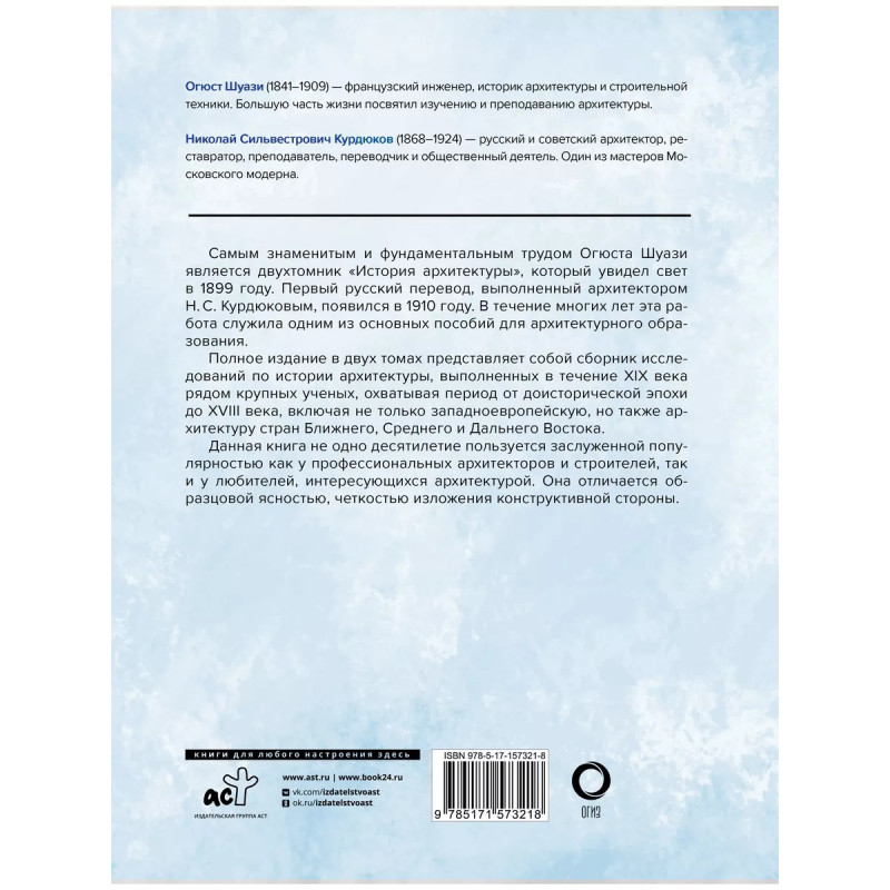 История архитектуры. От доисторической эпохи до XVIII века. Полное издание в двух томах книги французского инженера, историка архитектуры и строительной техники Огюста Шуази не одно десятилетие служило одним из основных пособий для архитектурного образования и до сих пор пользуется заслуженной популярностью как у профессиональных архитекторов и строителей, так и у любителей, интересующихся архитектурой. Оно отличается образцовой ясностью, четкостью изложения конструктивной стороны. Печатается в первом русском переводе 1910 года Николая Сильвестровича Курдюкова. Более 850 иллюстраций!