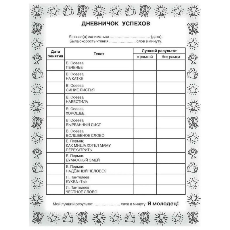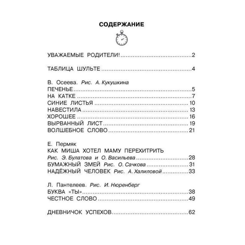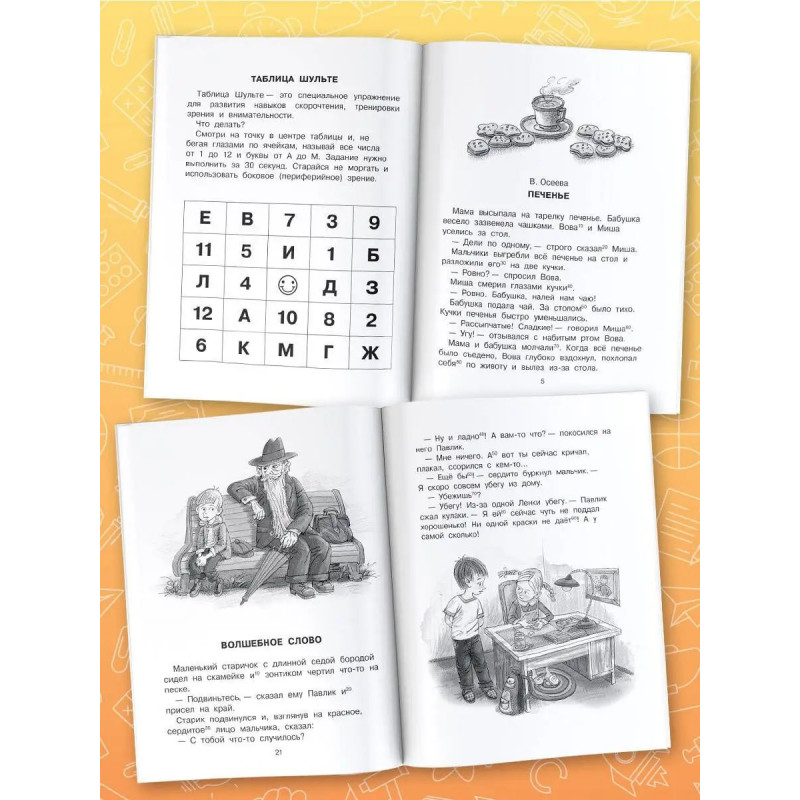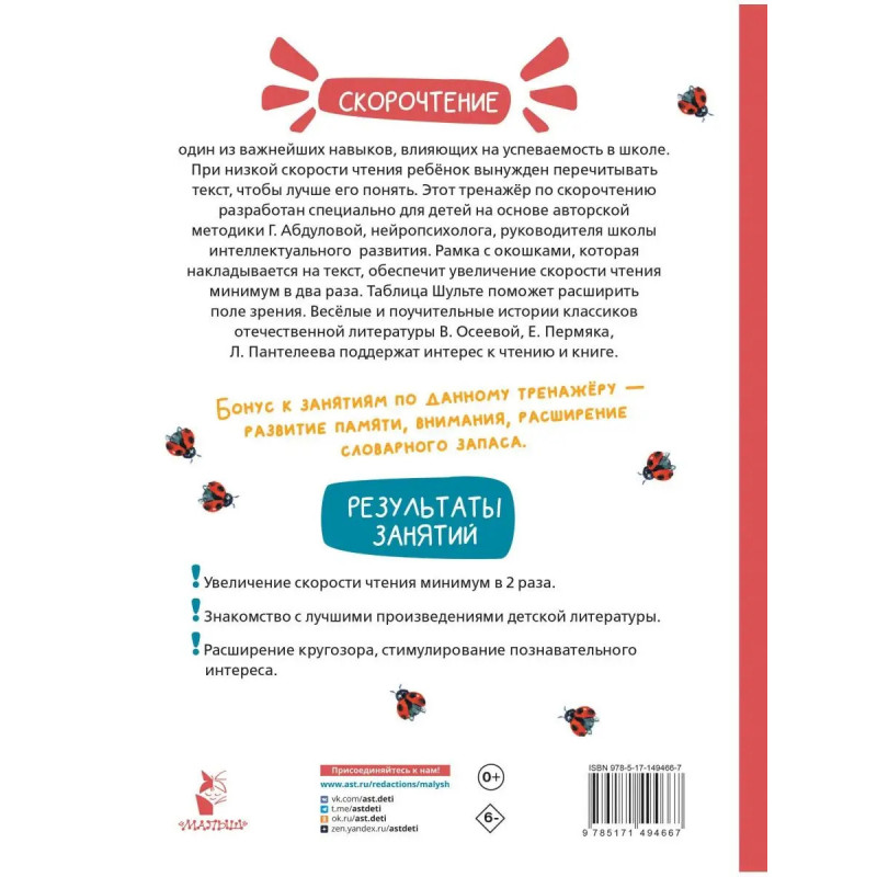7 причин купить книгу: - Увеличение скорости чтения минимум в два раза. - Знакомство с лучшими произведениями детской литературы. - Развитие памяти, внимания, познавательного интереса, увеличение словарного запаса. - Таблица Шульте для расширения поля зрения. - Специальная рамка с окошками, которая накладывается на текст, и позволяет значительно улучшить технику чтения. - Занятия по авторской методике Г. Абдуловой, нейропсихолога, руководителя школы интеллектуального развития, - Тренировка одного из самых важных навыков для успешного обучения в школе.