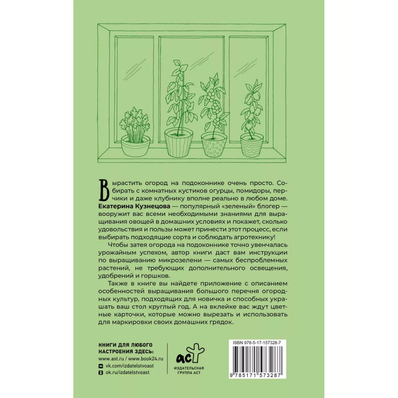 Огород на подоконнике. Идеальный урожай не выходя из дома. Огород в домашних условиях - это не мечта, а реальность! Выращивать свежие овощи и ароматные травы у себя в квартире может каждый, достаточно лишь разобраться в теории и приступить к делу! Опытный садовод, биолог, автор зелёных мастер-классов и укротитель комнатных джунглей Екатерина Кузнецова расскажет, как создать огород у себя на окошке и собирать богатый урожай зимой и летом. В руководстве она собрала подробные инструкции, советы по выбору инвентаря и семян, а также QR-коды на полезные ресурсы для новичков. Вы научитесь выбирать и высаживать растения, удобрять их, устанавливать правильный свет, бороться с болезнями и вредителями. Книга дополнена цветной вклейкой с милыми карточками для маркировки домашних грядок.