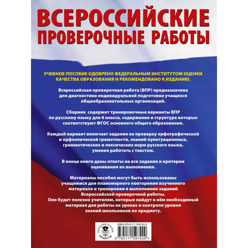 Русский язык. Большой сборник тренировочных вариантов проверочных работ для подготовки к ВПР. 6 клас. Пособие предназначено для самостоятельной подготовки учащихся 6 классов общеобразовательных организаций к Всероссийской проверочной работе по русскому языку. Сборник включает 10 тренировочных вариантов работы, которые по своему содержанию полностью соответствуют Федеральному государственному образовательному стандарту основного общего образования. Каждый вариант включает задания на проверку орфографической и орфоэпической грамотности, знаний пунктуационных, грамматических и лексических норм русского языка, умений работать с текстом. В конце книги даны ответы на все задания и критерии оценивания их выполнения. Пособие может быть использовано учителями для аудиторной работы в классе.