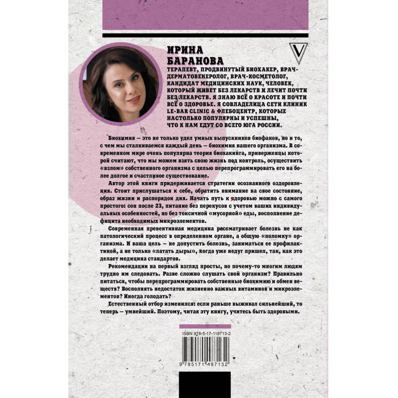 Проведи тело с пользой. Занимательная биохимия вашего организма. Я знаю все о красоте и почти все о здоровье. Я совладелица сети клиник Le-Bar Clinic Флебоцентр, которые настолько популярны и успешны, что к нам едут со всего юга России. МЫ ВСЕ В ДЕФИЦИТАХ важных витаминов и микроэлементов. Основной принцип биохакерства - не допустить болезнь, заниматься ее профилактикой, а не только "латать дыры". Главный принцип биохакерства - умение слушать свой организм. База биохакинга - правильное питание, которое перепрограммирует ваши биохимию и метаболизм. Лично моя система питания - это LCHF, то есть Low Carb High Fat, что означает "мало углеводов, много жиров. Вы можете выбрать что-то свое. Скоро тенденции биохакинга займут главенствующее место в системах оздоровления, продления жизни и улучшения ее качества. Ирина Баранова - продвинутый биохакер, врач-дерматовенеролог, врач-косметолог, кандидат медицинских наук. Человек, который живет без лекарств и лечит почти без лекарств.